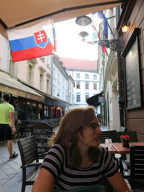 We eventually settled in at a brewpub for dinner, where Chad found some especially delicious beer (also pictured in an earlier post). Lots of bars and restaurants had flags and television screens up, as Slovakia was playing in the European championship soccer tournament that night. A fine, festive atmostphere, and people were quite friendly. I decided that I like Slovakia.