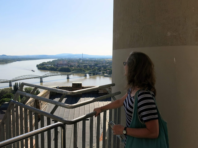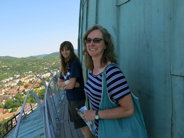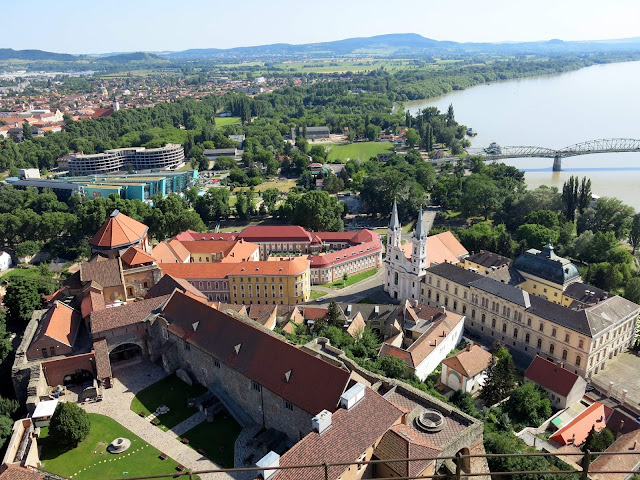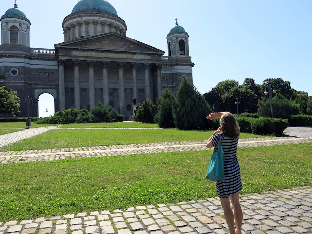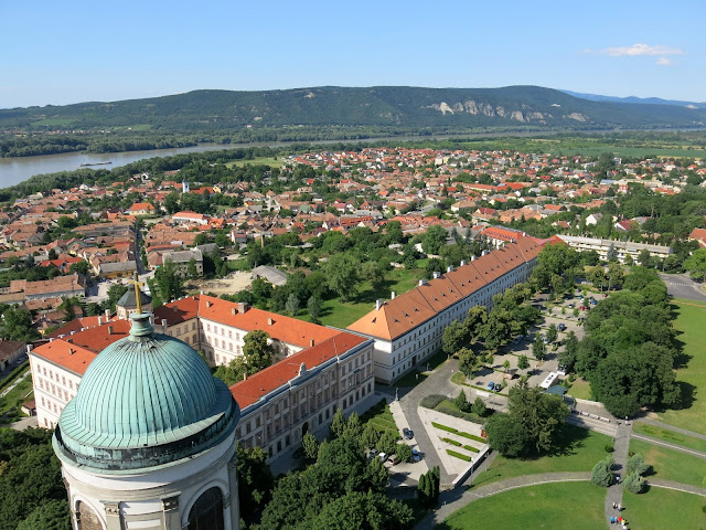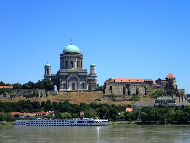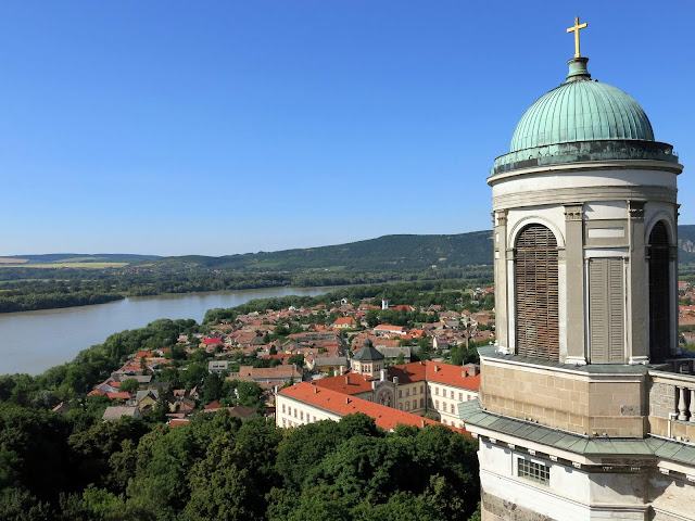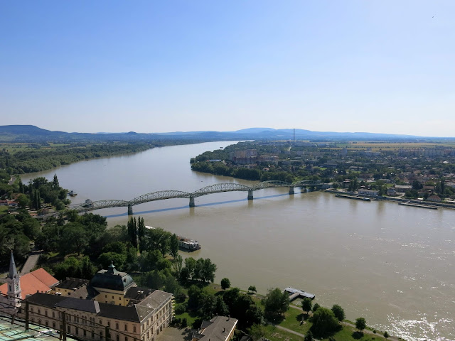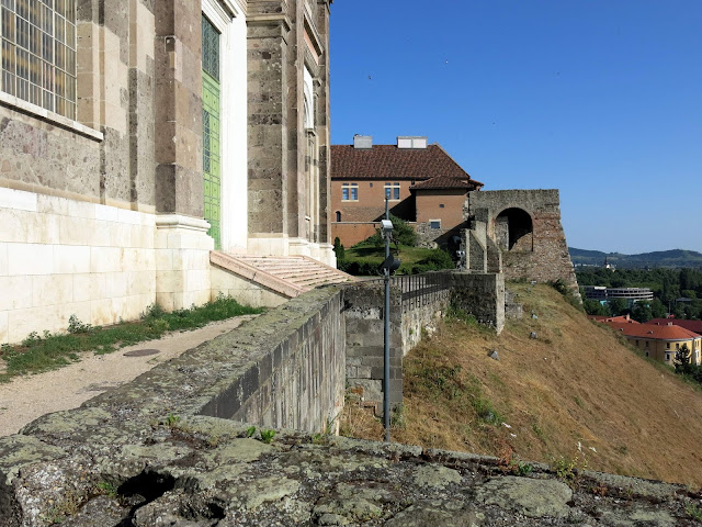 Here, you can see the Basilica of Esztergom as we saw it on our approach from the other side of the river. It is the largest church in Hungary, and contains an impressive collection of highly decorated church objects in its treasure room (no photographs allowed). Seven different churches, dating back to the 11th century have stood on the site -- the first one was where our old buddy King Stephen I was crowned; the consecration of the current incarnation was celebrated with a newly composed mass by Franz Liszt. Bits and pieces of the older structures still remain, including one entire side chapel.