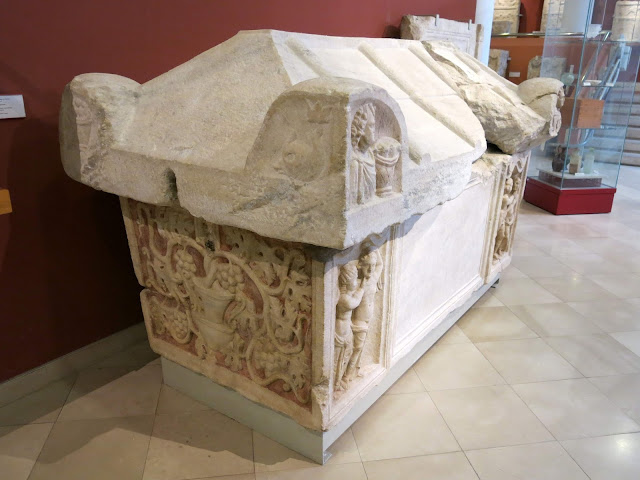 Carvings were not all politically oriented -- there was quite an interesting series of sarcophagi from the region near Budapest, tracing the impact of Roman art and culture on the preexisting community of stone carvers. I like the prevalent grape vine motifs.