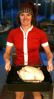 BikeBoy December 22, 2011 #anna #foodNimue says Anna's new bike jersey makes her look like Santa... well, maybe a slightly demented, capon-weilding Santa's helper? You be the judge! And yes, that is really a capon. I always thought "capon" was just a renaissance term for chicken, but apparently capons are a bit bigger. Now we're thinking about recipes for a whole renaissance meal (but not for this Christmas; maybe next...)