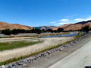 After dropping off the bridge, I followed my nose across the wildlife preserve (Don Edwards) and wound my way over to the Alameda Creek Trail, which turned out to be a delightful flat paved bike trail along a relatively wide creek drainage. The creek still had quite a bit of water in it; it was quite peaceful and there were a lot of birds to look at on the way over to the base of the hills.