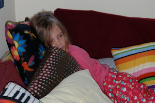 Ma April 07, 2009 #kiddoNimue quite enjoys burrowing in the big pile of fleece pillows I made for the family for Christmas and watching gentle cartoons on PBS on weekend mornings. This allows us to sleep in .... until 8am ....