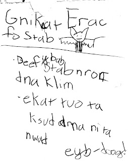We found this scrap while Nimue was cleaning her room this week; she assured me it wasn't gibberish. Took me a while to figure it out...