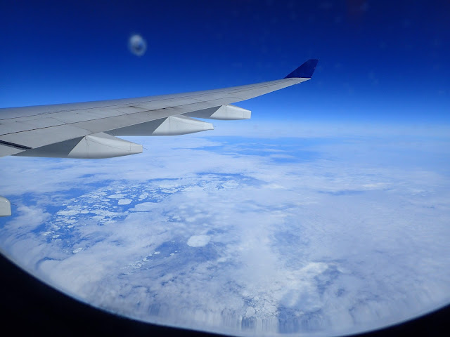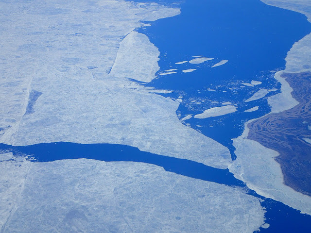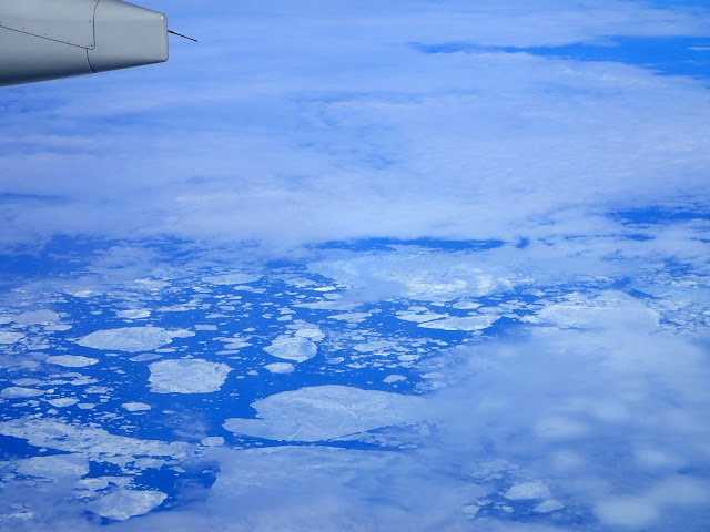 Imagine my delight on waking up from that nap and discovering that not only had the cloud cover dissipated, but that we were flying right over the northern coast of Canada, through what I think of as territory for the polar explorers who met various dire fates while searching for the Northwest Passage in the late 1800's. Pack ice -- something I've never seen before. Fun to watch go by from the warmth of the airplane! I stared out the window for quite a long time. Pictures out the plane window don't do it justice, but here are a few anyway. One can see how it might be difficult to navigate a route through, and there is a lot less ice now than there was then.