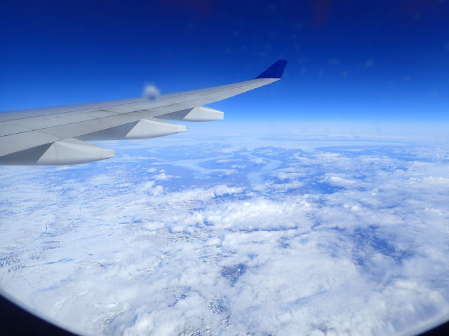 Woke up, noticed the map said we were over Greenland, took a peek only to see more clouds. Back to sleep for me.