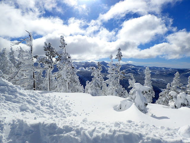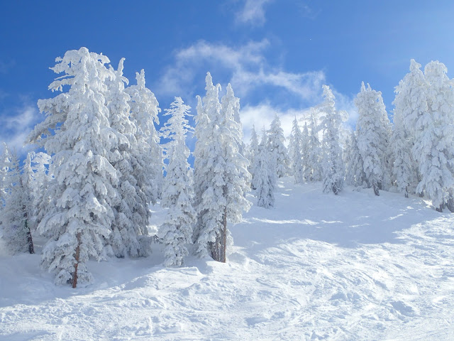 Although the snow was somewhat tracked up from the few lucky souls who were able to ski on Monday, it was still pretty good, with pockets of fresh, deep snow in the trees. The trees themselves were still plastered with snow, making the mountains very scenic.