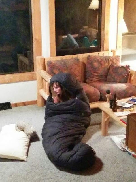 Chilly kid uses the sleeping bag to transform herself into a grub.