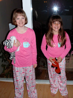 It's always a good sign when both kids at a sleepover show up in matching pajamas. Nimue pointed out that they are all set up for both "Twin Day" and "Pajama Day" at school.