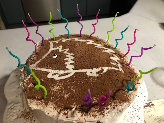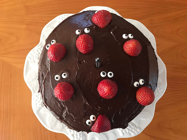 And, of course, two fine excuses to make demented birthday cakes. There were eyeballs down the sides of the first cake too -- one for each year, if you counted them all up. It might be my favorite ever.