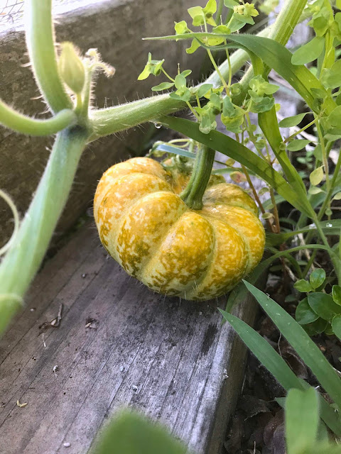 The usual too-many grapes and apricots (freezer is overflowing, and I've been fermenting soda from the grape juice), along with some tomatoes, peppers, and a couple of teeny tiny volunteer pumpkins that I didn't plant.