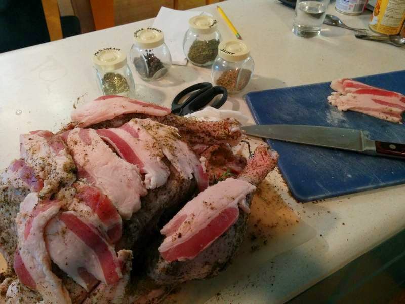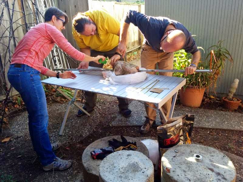 Step 8: Friends arrive; con friend into doing the slimy part of getting the turkey onto the spit pole.