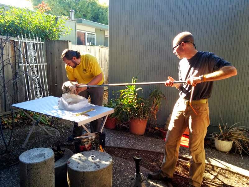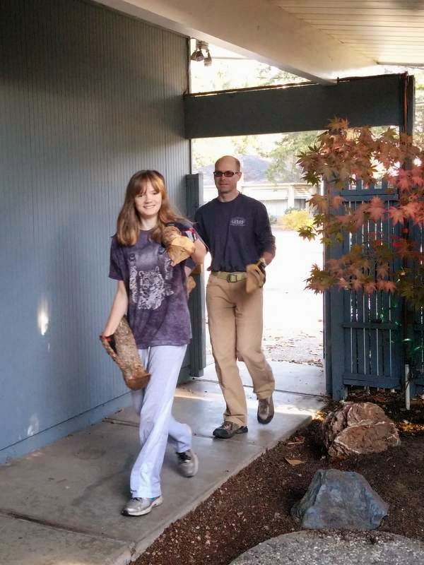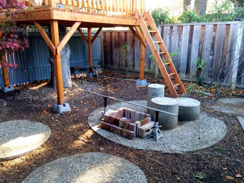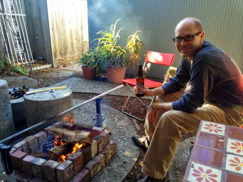 Step 4: Improvise a fire pit in the front courtyard with some old bricks. (These are the bricks a neighbor was getting rid of several years back, originally salvaged from a building up in SF decades ago -- I knew they would come in handy sometime...)