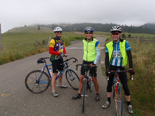 Steve, Bruce and Chad, smiling because they have no idea of the steepness of the hill hidden in the fog behind them...