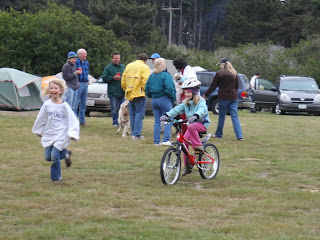 I went up very early on Friday morning with Randy, and we rendezvoused with Bruce and Steve for breakfast at Pat's in Guerneville - a tasty and very traditional diner, owned by the same folks since 1945. We then got a great ride in, going down the coast to the rather steep Meyers Grade road, then down Fort Ross road almost to the little town of Cazadero, where we turned on King Ridge road and got in a few more climbs, before descending Hauser Bridge road then climbing some more to get to Seaview road. Here we considered dropping down Kruse Ranch road, but it's unpaved and, at the top, quite steep -- this didn't look so appealing, but Timber Cove road, a few miles further along, looked like a good bet. It proved to be a screaming descent on good pavemement, dropping us from the ridge pretty much straight down onto Hwy 1. We rode north on 1 back to the campground, making a loop of about 50 miles, up and down some very steep hills, and racking up nearly 8,000 ft of climbing for the day. By the time we got back to the campsite in the evening, lots of other campers had set up, and my Mom had arrived, shortly followed by Anna and Nimue. The Schmidts had also arrived, with their girls, so Nimue had some other kids to play with. BBQs and homebrew were quickly deployed, and a fine evening was enjoyed by all.