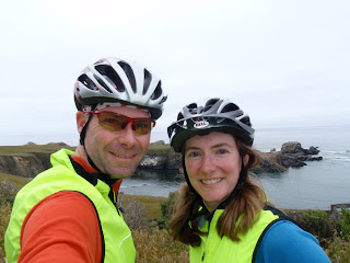 Saturday morning, my Mom and Nimue went wandering off is search of tidepools with the Schmidts' girls and some others, while Anna and I set out for a ride. I didn't get 20 feet before realizing I had a flat... but a quick tube replacement, and we were on our way. We took a great route, up Hwy 1 for a few miles, then turning inland on Kruse Ranch Road, a quiet dirt road that, as it turns out, climbs gently through rhododendron forests to the tiny hamlet of Plantation. The steep part I saw the day before is short, and only at the very upper end; otherwise, it's a great little road, but more suited to climbing than descending. It then connects to Hauser Bridge road, which descends to a creek and then climbs like crazy back up out of the canyon... emerging into rolling pastureland populated by cows and calves. I remembered going down this hill the day before, and thinking what a tough climb it might be in the other direction, never for a moment considering I might be doing so the very next day! The road continues through terrain much like this -- no cars, a couple of other cyclists, very pretty -- emerging in a miniscule native american town on an only-slightly-larger road. A long and crazy rollercoaster descent eventually dropped us back onto Hwy 1, and we cruised back down to the campsite to make a big loop. We didn't ride all that far (maybe 35 miles) but racked up about 3500 feet of climbing. For me, it was well over 10,000 feet for the weekend!