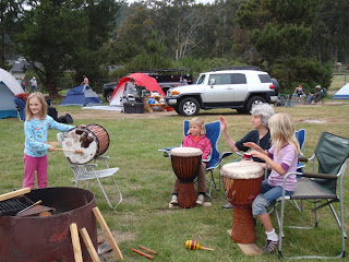 After some snacks to recuperate, we joined the dozen or so campers who spent their morning diving for abalone in getting the mollusks cleaned up and ready for eating. This involved an ad-hoc assembly line, getting the abs out of their shell, cleaned, trimmed, scrubbed, trimmed some more, and sliced thinly; then each slice was pounded pounded pounded! before being declared ready. With lots of hands, this went pretty quickly. Meanwhile, margaritas were being blended, other beverages were being liberally applied to the crew, and a variety of drums and other percussion were brought out...