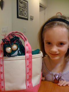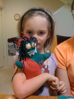 Nimue with her Valentine's monster... a few weeks previous, she sketched out a monster she envisioned, and Anna turned it into reality. It really does look just like the drawing!