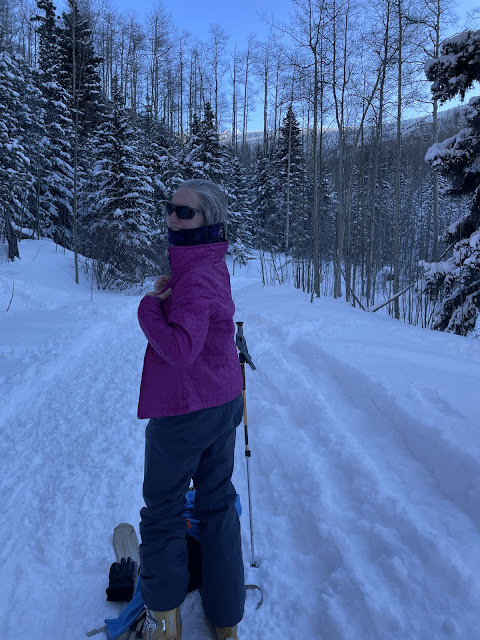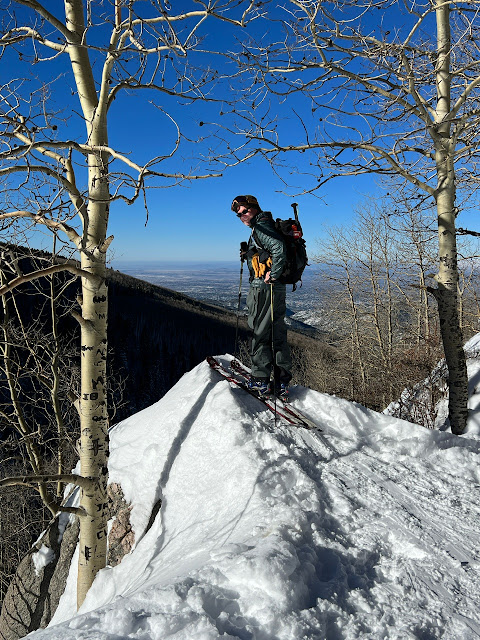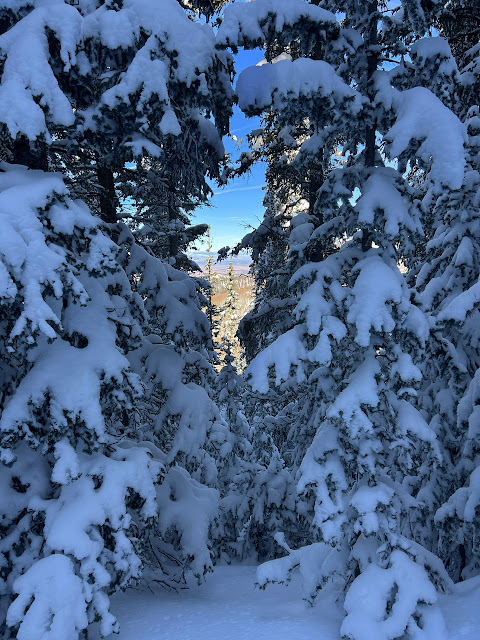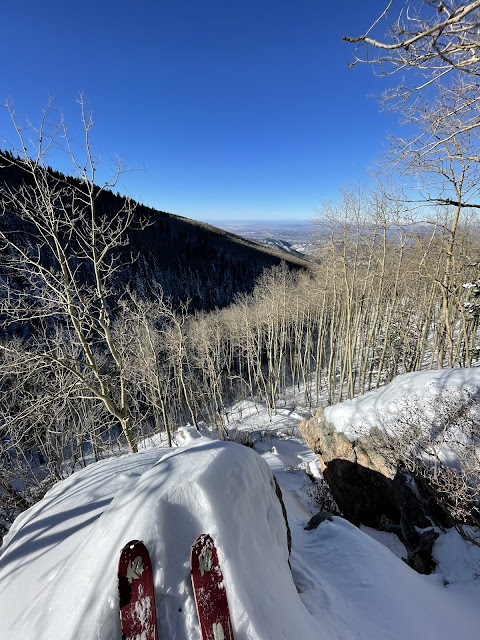 It was a chilly day, in the teens but no breeze. We skied all the way to an expansive overlook, about 11,400 feet, and then carved turns through a big open bowl until we got tangled in a mess of deadfall… which is fun in its own way...