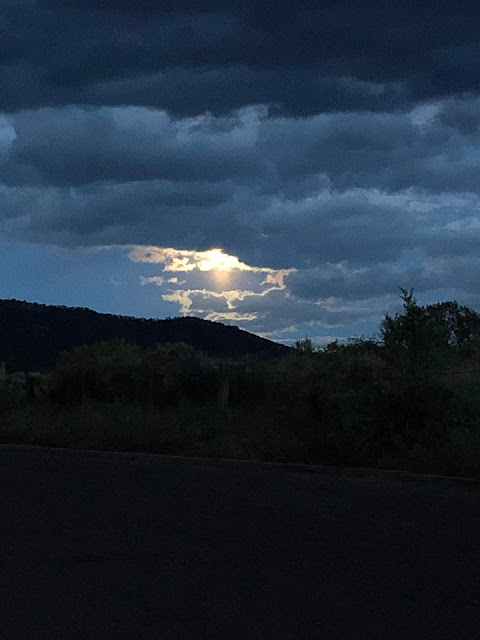You might have noted the gray sky in the previous picture; we did get an afternoon thundershower one day. Chad and I enjoyed a glass of wine on the porch while watched the rain and listened to the thunder. By dinner, the rain had stopped, and the clouds started to clear a bit, but not all the way. The resulting moonrise we saw walking up the hill back to the condo after dinner was pretty spectacular.