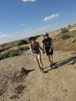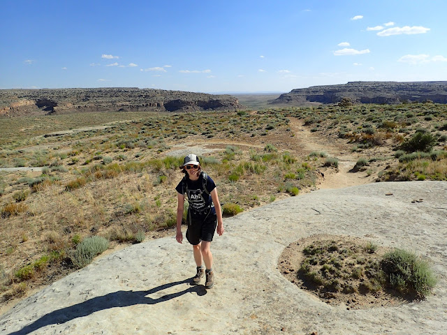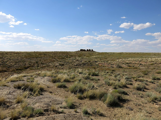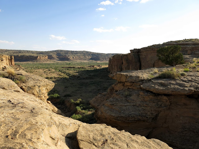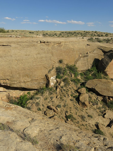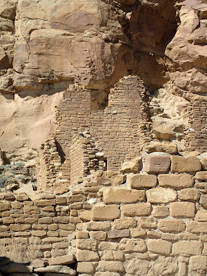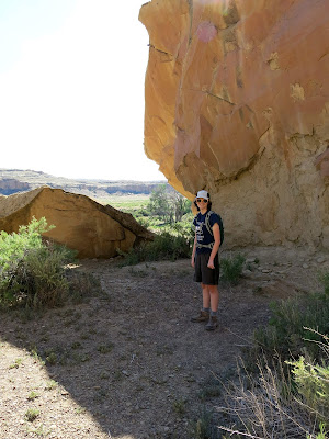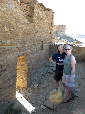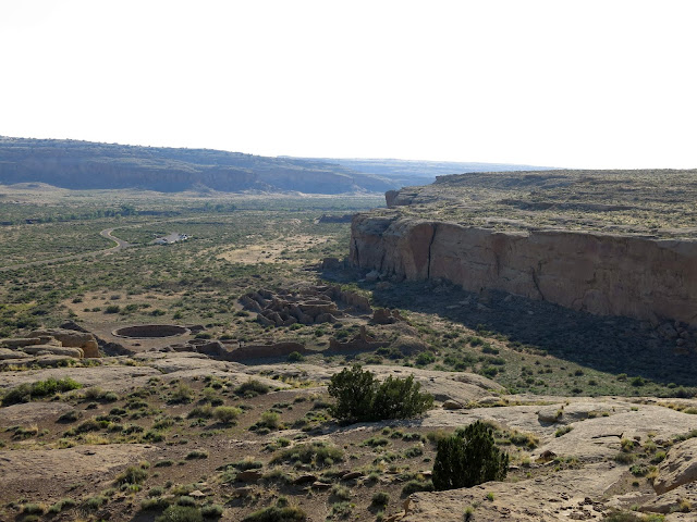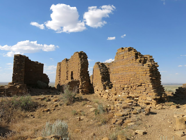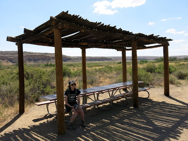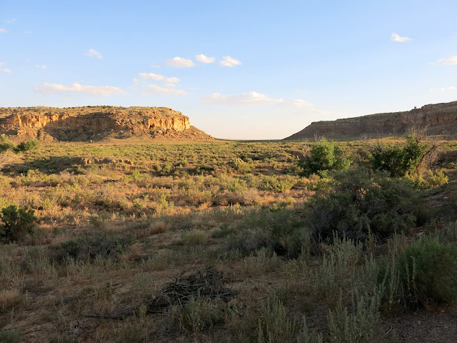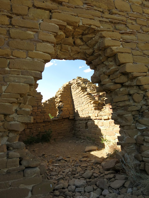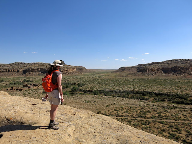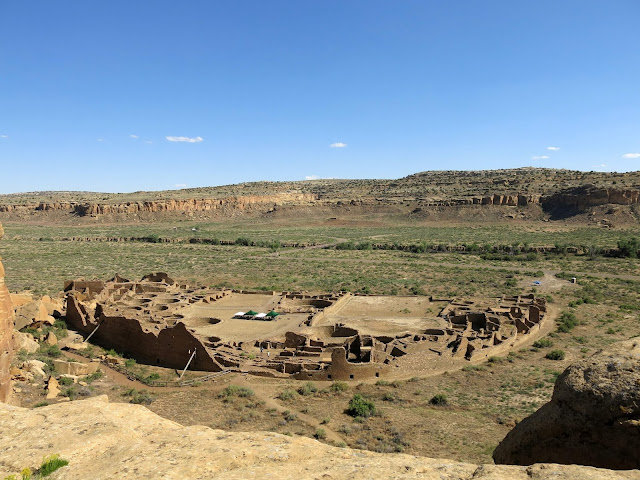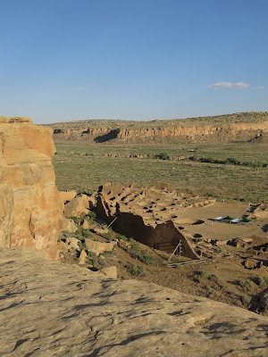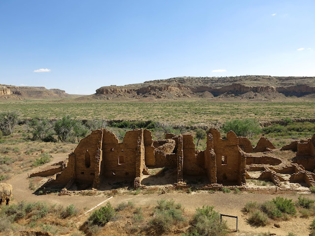 The main goal for the day was to see the amazing pueblo ruins at Chaco Canyon. We were also hoping to find a place to camp -- I had no reservations, as there had been some work being done at the campground during the early part of the summer and they weren't guaranteeing spots. On the bright side, once we wound our way in the back way along a miles-and-miles-and-miles-long washboarded road, we found plenty of available sites in the park campground. I don't have a picture, but this is the only campground I know of where you can see pueblo ruins right from the sites (just off the right of this photo).