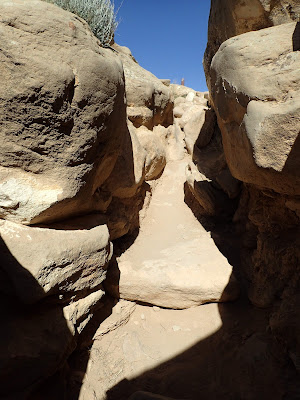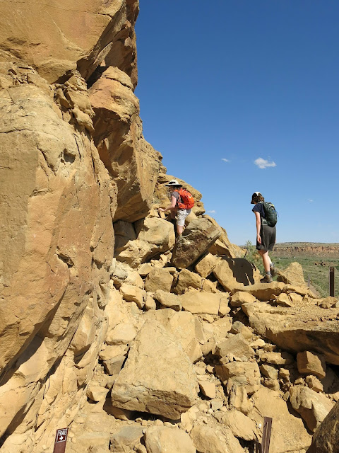 We knew there were some structures up on top of the adjacent mesa, so naturally we had to follow the trail. Yes, this is a trail -- see the signpost at the right of the picture?