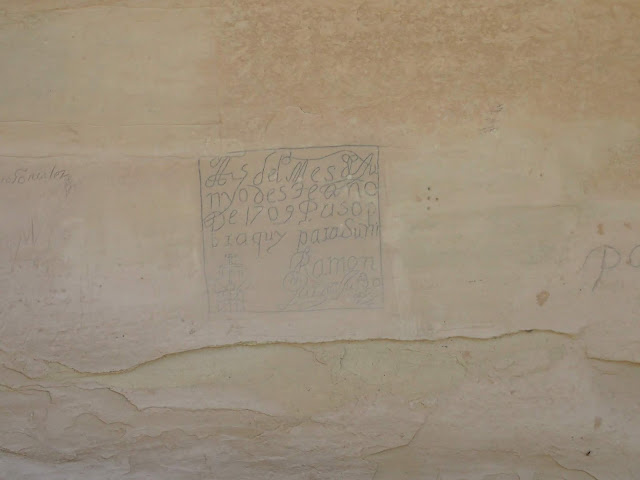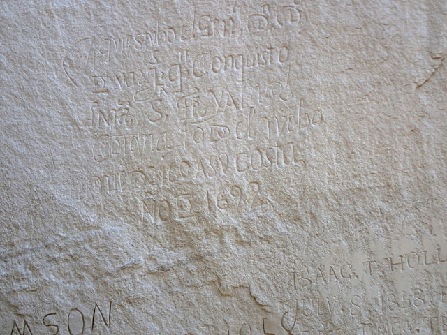 Many of the earlier inscriptions are in Spanish. This one looks dark due a now-thought-to-be-misguided former attempt to "restore" the inscriptions by rubbing graphite into them.