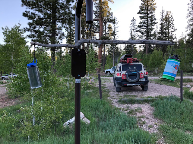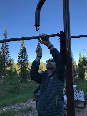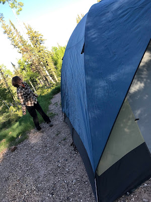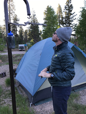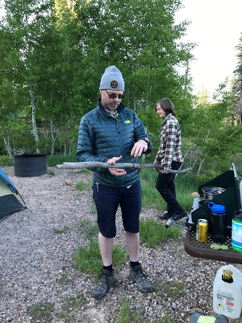 Our campsite for the night was back in a forest campground just north of the park boundary. By this point, the kid was proficient at helping put the tent up so had time to run amok and read while we got dinner ready. You might notice the larger amount of insulation on us at this point -- at almost 9000 feet, it was chilly. The forecast was for temperatures to drop to around freezing that night. Very different conditions than most of the rest of the trip!