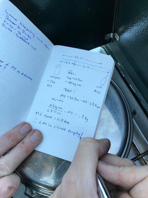 While I prepped dinner, Chad amused himself by rigging up a balance and doing careful measurements and calculations regarding our near-empty fuel canister,