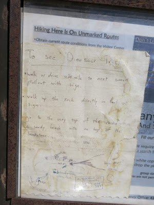 Now, the Dinosaur Quarry in the monument is not the only place one can find signs of the beasties in these parts, so we kept our eyes open during the rest of the trip too. We didn't have time so search out the dinosaur trackways around Moab, but did have time later in the trip to go on a wild goose chase when we noticed a "Twenty Mile Wash Dinosaur Track Site" marked on the Grand Staircase-Escalante National Monument map.