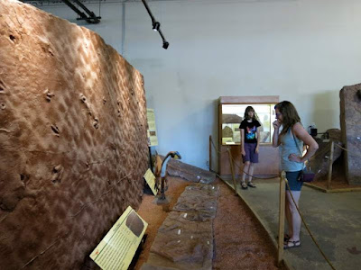Denied our obvious three-toed fossil footprints, yet later in the trip we stopped at the St. George Dinosaur Discovery site. This is a cute little museum built on top of a set of in-situ dinosaur prints that a dude discovered when he was leveling a hill on his property. Fortunately, the site was preserved; the actual rock deposit makes up a large part of the floor.