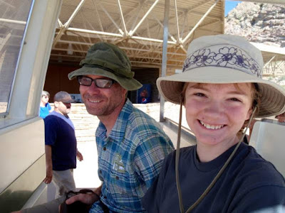 Happy peoples on the tram that goes from the visitors center up to the dinosaur gallery. The tram had little dinosaurs painted on the side, which Nimue thought were cute.