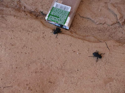 Someone had left an empty tictac container wedged in a crevice in the rocks in an orientation such that a couple of curious beetles had crawled in but couldn't crawl back up the slippery plastic to get back out. The clicky scratching sounds we heard were the beetles desperately trying to climb up toward the opening. Chad gently turned the container around so the beetles could escape.