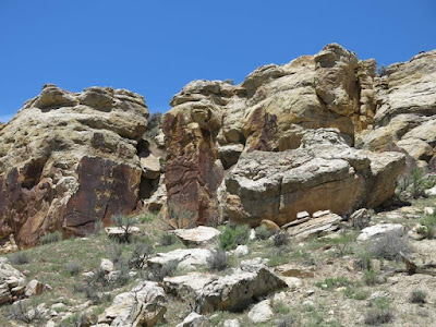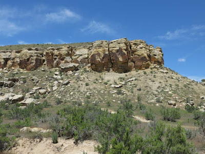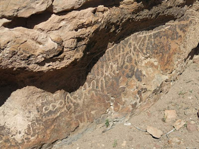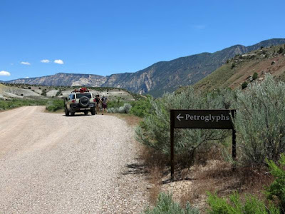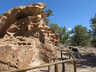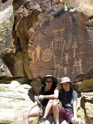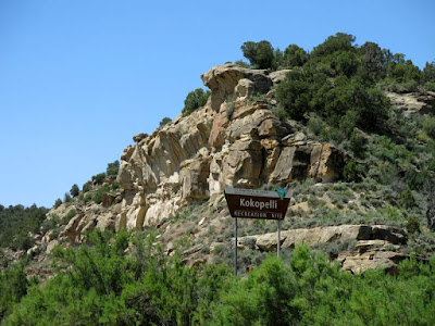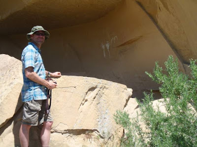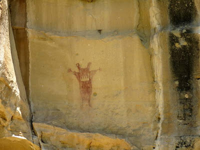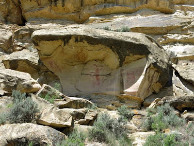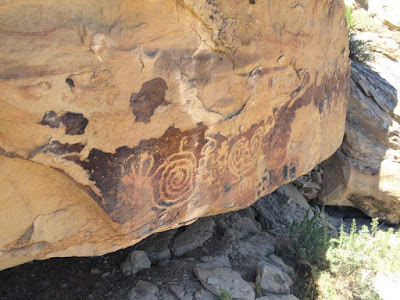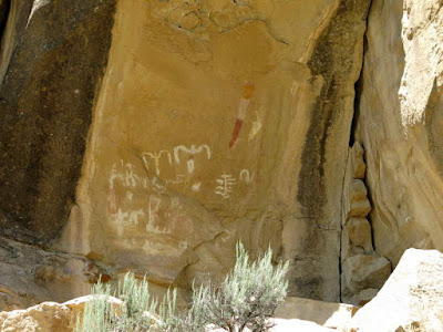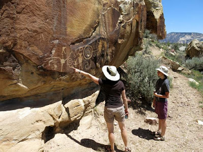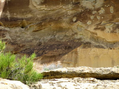 The highway we followed from Dinosaur down to the Mesa Verde area goes through the Canyon Pintado, or "painted canyon" historic district. The BLM has put up useful markers so one can find both petroglyphs and pictographs. As we learned, petroglyphs are designs chipped into the rock; pictographs are painted on with mineral pigments.