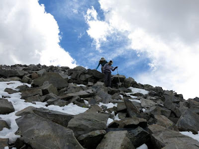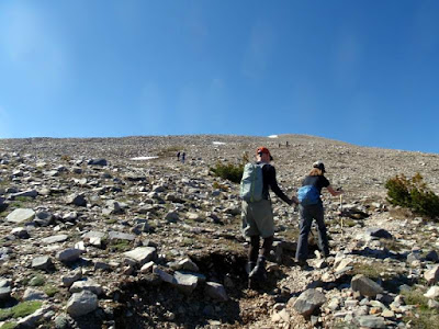After this point, we were above the tree line, and began to work our way up the rubble along the ridge. You can see a few parties ahead of us at this point.