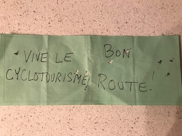 The conductor had us load our bikes into a different car than the one we had to sit in, which always makes me a little nervous. There was no problem, however, and upon retrieving the bikes as we got close to our station, I noticed a note that someone had written a note on the back of a train ticket and left in the clear pocket on the top of my handlebar bag. "Long live bike tourism! Have a good trip!" How jolly.