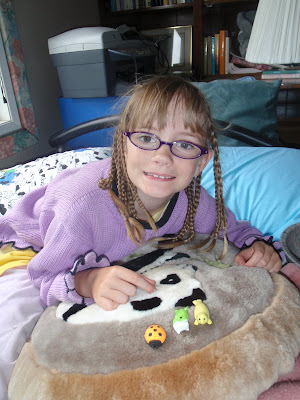 Nimue got the "Go to Garage Sales with Gramma" experience while we were off on our bikes. I gave her $3.00 and she came back with many new stuffies, some of which are pictured with my dad below.
