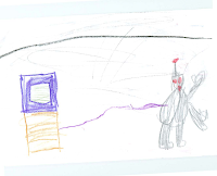 Nimue designed this TV-controlled robot in great conceptual detail -- the sketch does not nearly capture it all! You'll just have to imagine it for yourself... or have Nimue demonstrate the accompanying sound effects and robot movements.