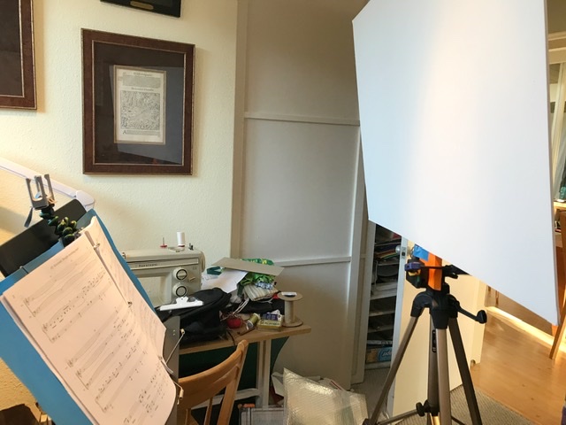 The biggest challenge in my end was setting up the required plain white background for the video, given that there are no blank walls in the house. I ended up attaching a white piece of coroplast to a tripod to put behind me. I had to use a large bar of chocolate to clamp it properly (that's the orange thing you can see below the white backdrop; it came to hand when I was looking for something to use as a stabilizer), and then ruefully discovered when I went to eat it later that it had been crushed...