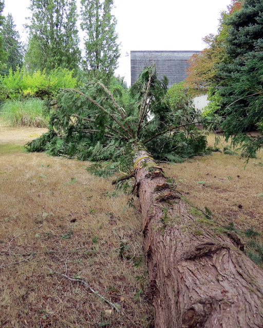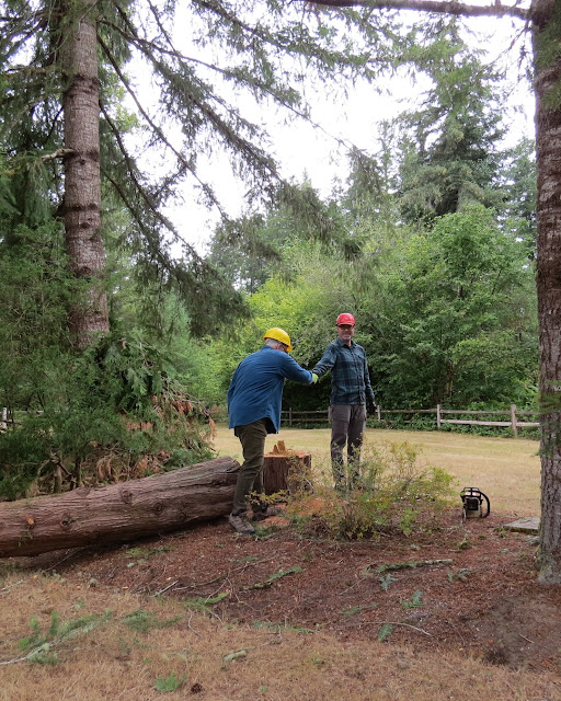 In addition to visiting my parents and my brother's family, we fulfilled a few obligatory chores, the most fun which was felling a giant tree in my parents' yard. Chad put his Forest Service experience to good use, and dropped the big cedar without hitting either the garage to the right, or the cherry tree to the left. It was getting a bit too big for the space it was in. My dad will get a lot of fence posts out of this one.