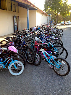 Ma October 04, 2012 #school #bikeTo celebrate International Walk to School Day yesterday, we kicked off our annual "Walk and Roll to School" incentive program. Not only were the bike racks overflowing, but I only saw a mere handful of cars drive by. The dropoff circle was empty. Eerie, for a school of 850 kids.