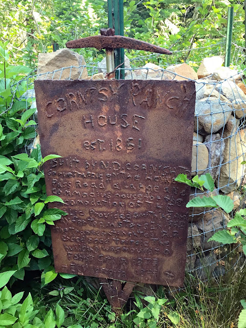 You can really see how much we climbed up from the river the previous day getting up here. There were a number of good spots to set up a tent here, but it was too early to stop, so we kept going along Henness Pass Road. Eventually we hit some pavement, and followed it to the site of the Old Cornish Ranch House. Built in 1861, Cornish House was a "large and comodious house for the accomodation of the public [which] provided smithing and hay for teamsters" for several years before the transcontinental railroad led to less use of the road. We ate lunch in the shade and took advantage of the creek to refill our water supply.