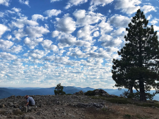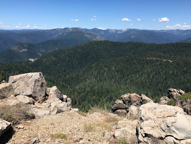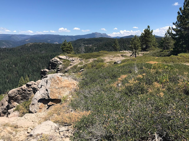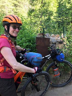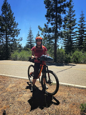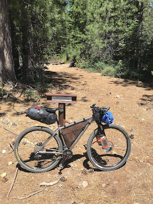 While the kiddo was off being a camp counselor, Chad and I took advantage of one weekend to do a short bikepacking trip. This wasn't particularly carefully planned, but we wanted an excuse to try out our new bikepacking quilts -- they are light and small and pack down into teeny tiny pucks that can be easily stuffed into a saddle bag. We hadn't been up to Downieville for a while, and also had the advantage of knowing that one can ride up Mountain House Roadfrom there and hit a network of dirt roads and trails that are fun to explore even if you don't go far. So, we drove up on Friday afternoon, briefly said hi to Linda, loaded up our bikes with our new down quilts, and rode on up the hill to find a camping spot for the night.
