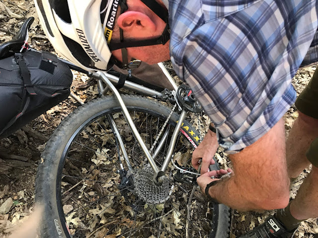 Of course one can't have an adventure weekend without at least a minor mishap. In this case, a stick flipped up off the trail at the wrong moment and broke Chad's derailleur hanger off. Fortunately, he whipped out the spare derailleur hanger that had been kicking around his pack for just such an emergency and rapidly fixed it. I deemed this item (acquired circa Christmas 2013) to have been the best stocking stuffer ever.