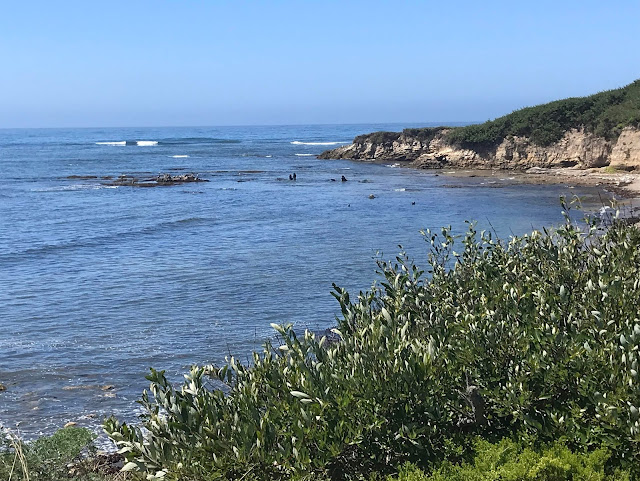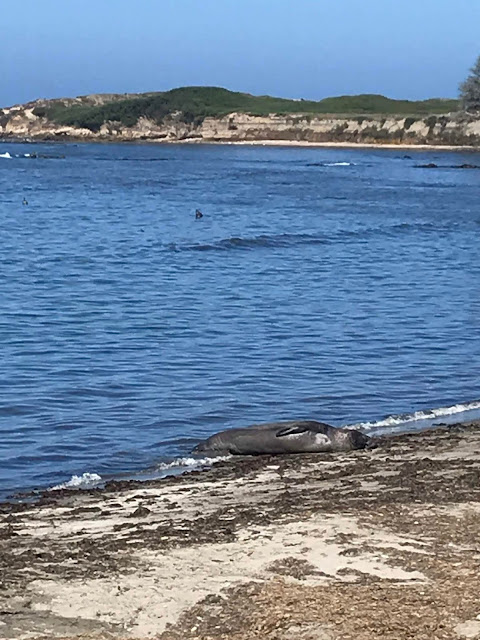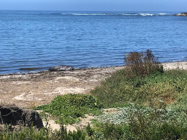 Further down the beach, we could hear deep rumbling noises, which we found were emanating from a pair of juvenile males practicing some of their dominance moves. Again, it's hard to tell from this picture, but they were using their tails to counterbalance the fronts of their bodies as they reared up out of the water and slapped chests. Quite entertaining to watch and listen to!