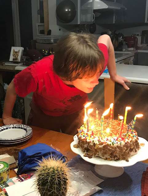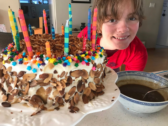 When asked what kind of cake was desired, the kid replied "I want a confection!" Chocolate cake with coffee butterscotch, chocolate ganache, and cream cheese frosting, covered with toasted almonds was the result. (Fortunately Chad made it home from his work trip in time to share cake.)