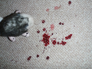 Ma April 06, 2012 #Bobber #yuck-oI came home the other day to find thick gooey bloodstains on the carpet. (Cat toy included for scale)
