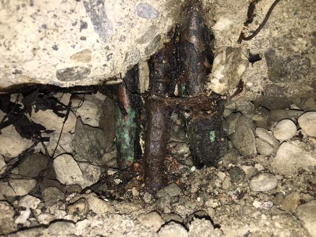 Today's new discovery while chipping out the slab around the toilet pipes so they can scoot the toilet over a bit: the copper water pipes were connected to a piece of steel rebar by a piece of wire. Stupid -- this leads to corrosion and leaking, all buried in the cement slab. Now they get to dig out even more concrete to make sure that they can replace all of the corroded pipe. I sort of wonder how long this has been slowly leaking into the slab