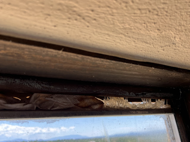 Ma July 21, 2024So we looked up at one of the high windows in the great room and saw what looked like a strip of duct tape peeling loose. Chad went to investigate and pulled the tape the rest of the way off.