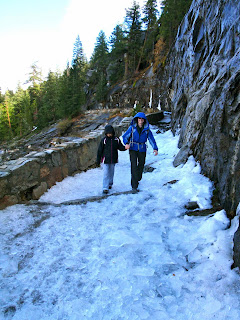 Ice on the John Muir Trail, coming back down from Nevada Falls. At one point, a big bit of ice and snow slid shooting over the trail from above, down into the abyss below. Staying close to the rock face was definitely the best strategy.