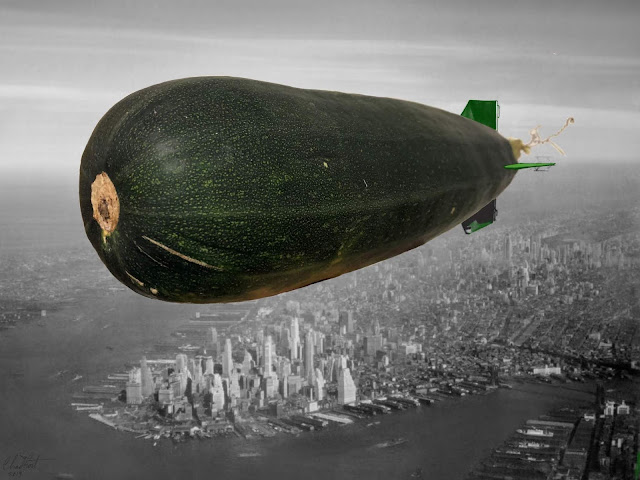 One of Chad's coworkers kept bringing in zucchini from his garden -- but only the ones that hid in the grass until they become 4-pound behemoths. After a few of these, I banned them from our house. Thus, Chad created the zucchelin!